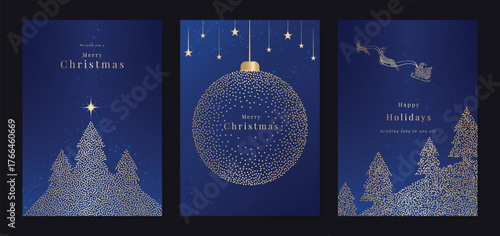 Christmas and Happy Holidays card vector set. Luxury gold victorian frame, leaves branch, flower, star, snowflake on navy blue background. Design illustration for poster, cover, invitation, ads.