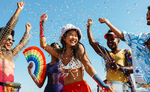 People celebrate at colorful carnival outdoors