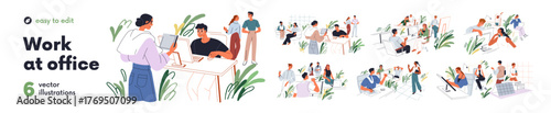 Office work life set. Employees, daily routine in corporate professional environment. Happy young colleagues communication in modern workplace. Flat vector illustration isolated on white background.