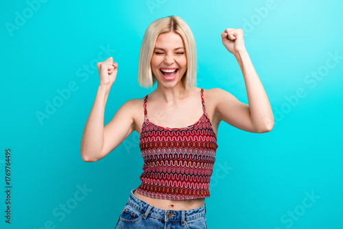 Young woman celebrates success wearing a red patterned top against a blue background smiling and raising arms