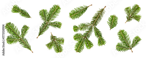 Set of green fir tree, pine or spruce branches isolated on a transparent background, PNG. High resolution. Natural evergreen elements for Christmas and winter decoration design.
