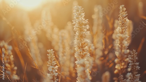 Golden hour sunlight illuminates tall, slender, light-beige wildflowers in a field.