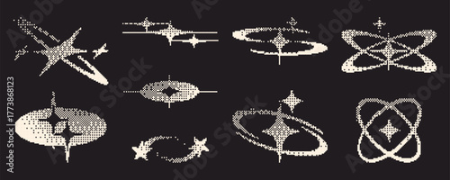 Y2k style pixel star icon set with sparkle elements and halftone gradients on dark background. Retro digital graphics - orbiting stars, decorative bursts and abstract shapes for nostalgic web design.