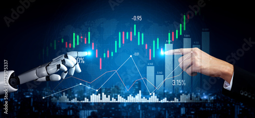 A human hand and a robotic hand point at ascending stock market graphs, symbolizing collaboration between technology and finance in data-driven decision making. Scalp