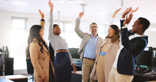 Corporate, people and hand stack in office for motivation, teamwork and celebration of success. Smile, staff and partnership for agreement, collaboration and solidarity support of company achievement