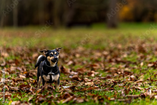 Mały pies w jesiennym parku – portret czworonoga na tle liści i trawy