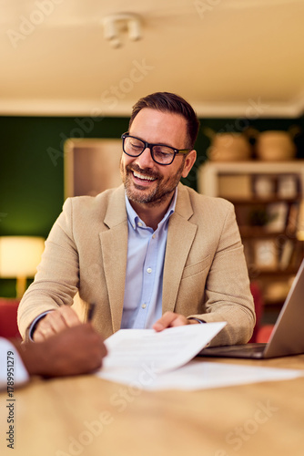 Professional Man In Beige Blazer Meets Client For Paperwork, Laptop Review, And Friendly Discussion