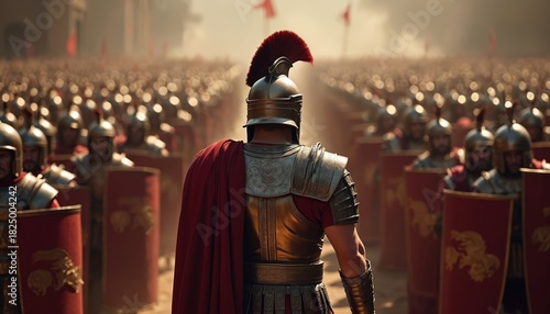 Roman centurion stands before army of soldiers in formation. Men wear metal armor helmets, holding shields. Military legionaries prepare for battle on dusty ground. Ancient warfare scene.