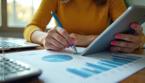 Woman reviews financial charts on tablet and paper. She uses pen to point at data, planning budget with laptop computer nearby. Person analyzes stats for better investment results.