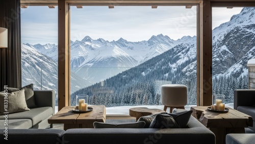 Cozy modern living room with large windows overlooking majestic snowy mountain range