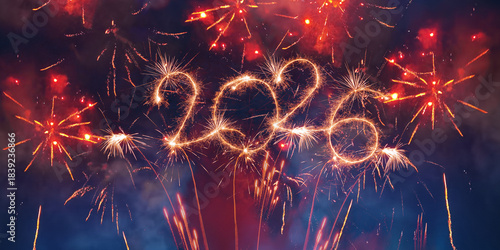 happy new year, new year's eve, silvester, new years eve, sparklers celebration greeting card, new year card - Year 2026 in sparkler font and firework fireworks pyrotechnic, blue night sky background