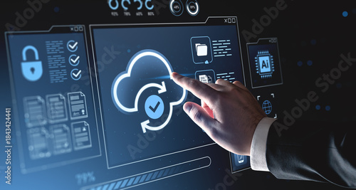 Hand interacting with holographic cloud computing interface on digital background showing cybersecurity and data synchronization concept.