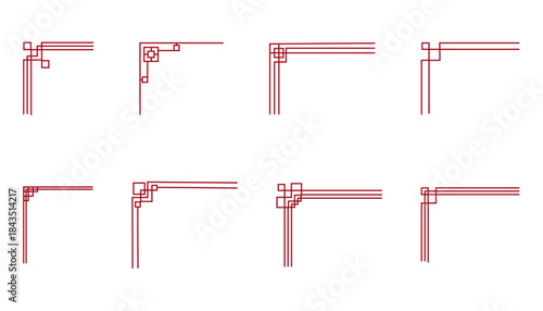 Korean traditional line borders set with knot corners ornament. Collection festive asian frame corners. Traditional Asian pattern for decoration of banners, holiday cards and Asian culture products