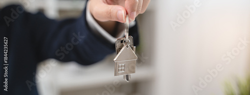 Close up view realtor broker holding home keychain in her hand and showing to new owner.