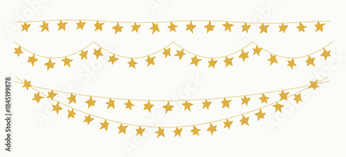 Star garlands, festive lights set. Christmas decorations on strings with starry sparkles, electric horizontal strands, Xmas holiday decor. Flat vector illustration isolated on white background