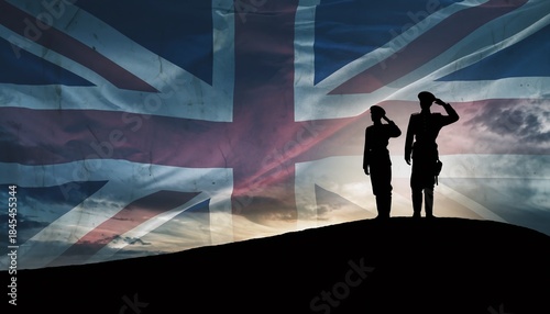 Two silhouetted soldiers saluting against a dramatic Union Jack flag background at sunset, concept for patriotism, remembrance, and national pride