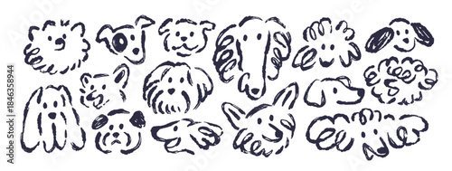 Dogs, charcoal sketch drawings set. Chalk scribbles, funny puppy heads. Outline hand-drawn line art doodles, cute canine animals in whimsical sketchy style. Creative handdrawn vector illustrations