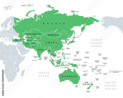 Asia-Pacific, or the Indo-Pacific, political map. Countries and territories of a major geopolitical and economic region of the world, adjoining the western Pacific Ocean, highlighted in green. Vector