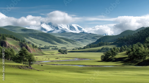 Snow capped mountains grassland blue sky green hills river pine tree peaceful scenic nature landscape
