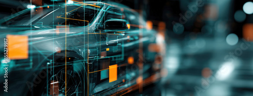 A sleek high-tech automobile featuring holographic data visualizations and smart technology sensors. Perfect for automotive innovation, digital transformation, and futuristic transport concepts