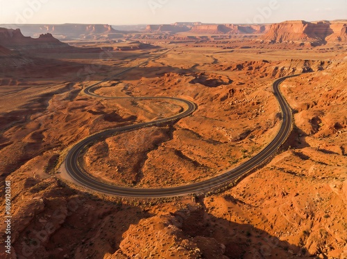 Aerial View Of A Winding Asphalt Road Cutting Through A Red Rock Desert Landscape