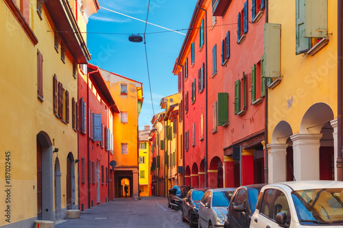 Medieval street portico with bright colored houses in the Old Town in the sunny day, Bologna, Emilia-Romagna, Italy