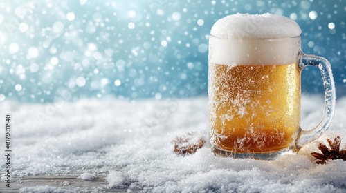 A frosty glass of beer sits atop a snowy surface, surrounded by a glimmering, ethereal backdrop that evokes feelings of winter celebration and warmth.