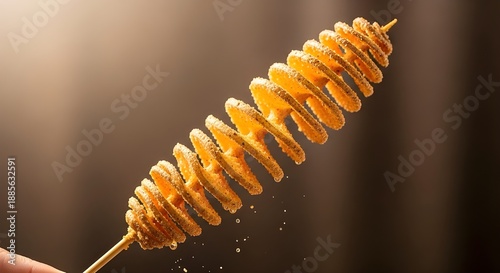 Close-up of a crispy spiral-cut tornado potato on a skewer with savory seasoning powder and oil droplets falling against a warm brown background.
