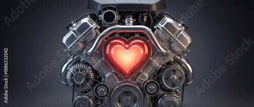 Car Engine with Red Heart, Creative Car Care and Maintenance Concept