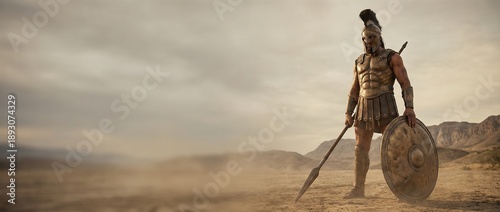 Ancient warrior man standing in desert with spear and shield against a cloudy sky. Historical battle concept. Epic biblical story for poster. Banner with copy space