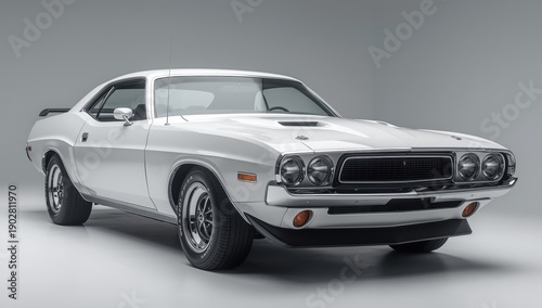 Classic white muscle car against a white backdrop