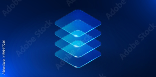 Abstract vertical glass blocks symbolizing scalable digital systems, AI architecture and data growth. Futuristic blue technology background with transparent shapes, minimal design and copy space.