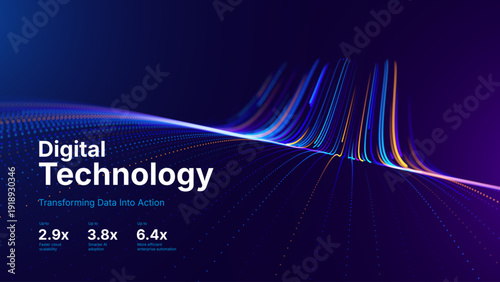 Technology Big Data Flow Background with AI Particles and Digital Stream Lines. Futuristic Data Science Concept. Tech Business Presentation or Annual Report Template. Vector Illustration.
