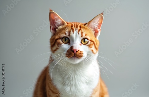 Close up of a ginger and white domestic cat face with bright eyes. This cute animal portrait shows a fluffy pet with long whiskers looking directly forward on a plain backdrop.