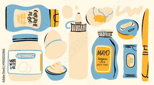 Mayonnaise sauces set, eggs, knife. Different container shapes. Plastic, squeeze, glass bottles, soft package, small bag, sauce cup. Hand drawn trendy Vector illustration. Isolated design elements