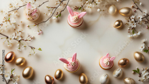 Marco de Pascua sobre mármol con cupcakes de conejo, huevos dorados y ramas de cerezo en flor, dejando un espacio central para texto.