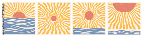 Sun shapes sunset sunrise, sea ocean waves illustrations. Retro groovy uneven wavy rays sunburst. Summer vacation, travel backgrounds. Water and sun silhouettes, square shapes, border templates set