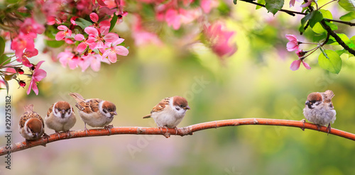 small funny Sparrow Chicks sit in the garden surrounded by pink Apple blossoms on a Sunny may day