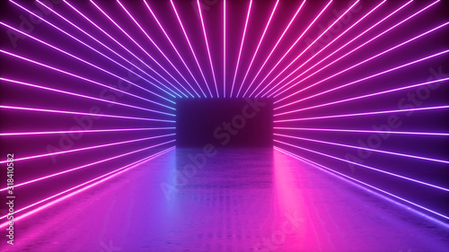 3d rendering, abstract neon background, empty square tunnel with pink glowing lines, long corridor, road, performance stage, floor reflection, ultraviolet light