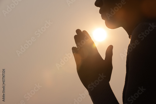 Silhouette of woman prayer position, Praying hands with faith in religion and belief in God on dark background. Power of hope or love and devotion. Namaste or Namaskar hands gesture.
