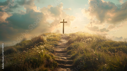 Path with stairs leading to Christian cross on hill, symbol of faith and hope, perfect for religious events and celebrations