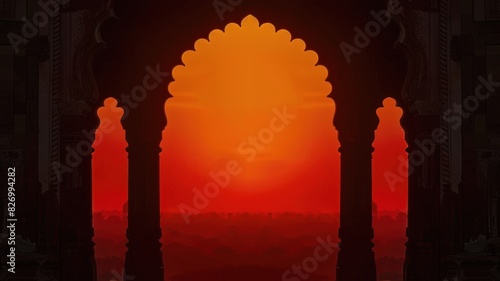 silhouette of ancient indian archway against vivid evening sky