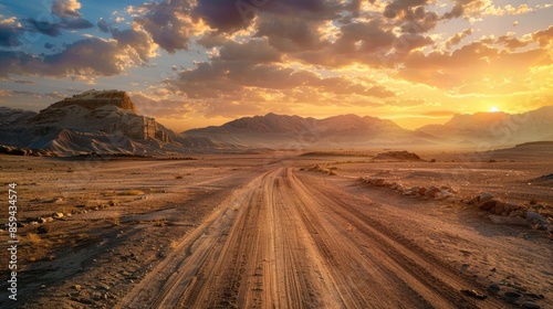 A long, dusty dirt road stretching across the open desert landscape