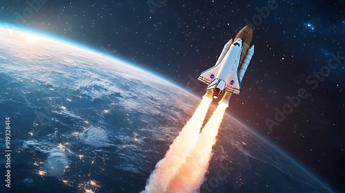 New space rocket lift off. Space shuttle with smoke and blast takes off into space on a background of blue planet earth with amazing sunset. Successful start of a space mission. Travel to Mars