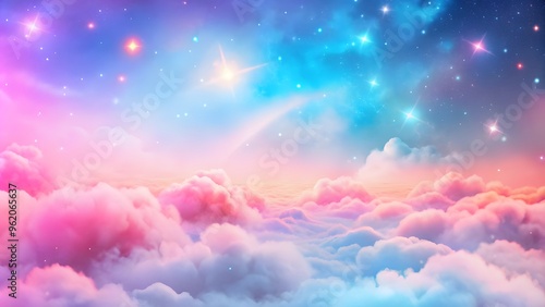 Pastel rainbow unicorn background including sparkling stars. A hazy, pink fantasy sky. Charming holographic area. pink and blue gradient
