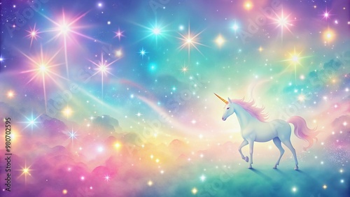 Whimsical pastel rainbow unicorn background features sparkling stars, hazy pink fantasy sky, charming holographic area, and fairy iridescent gradient backdrop.