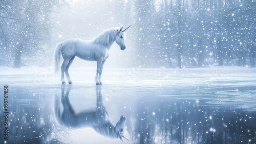A majestic unicorn stands in a snowy landscape, its reflection shimmering on the icy surface amidst softly falling snowflakes.