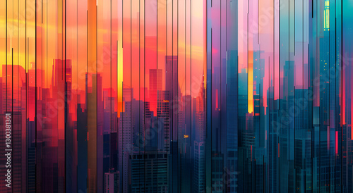 Abstrakcyjna panorama miasta o zachodzie słońca – futurystyczna wizja metropolii z pionowymi liniami i neonowymi barwami