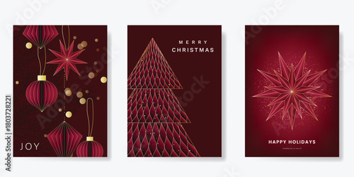 Merry Christmas and Happy New Year greeting card vector set. Luxury invitation with Christmas tree, leaves, sparkle, spot texture on red background. Design illustration for season's card, ads.