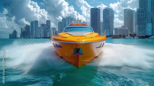 Szybka łódź motorowa przemierza wodę przed miastem.